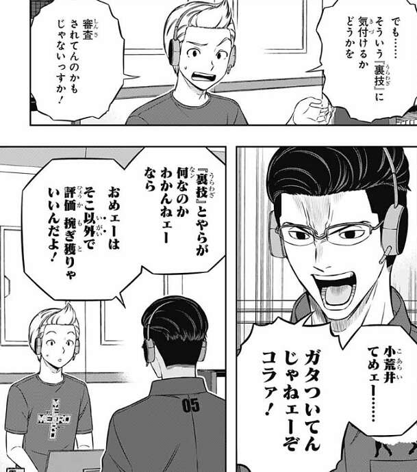 一方、負けた来馬5番隊ですが、来馬は昨日と同じ感覚で三雲を狙いすぎたと反省します。三雲が昨日とは違いレイガスト2枚でフルガードしていた事で固かったので、トリオンが低いなりの工夫ってワケか、と弓場が三雲の戦法が変わったことを評価しています。小荒井は、諏訪隊が動きのスムーズさが昨日と違いすぎると言い、水上隊と諏訪隊しか気づいていない『裏技』が絶対にある、と『裏技』の存在にこだわります。しかし、弓場は『裏技』にこだわる小荒井を叱りつけ、『裏技』以外での評価をもぎ取ればいい、と言います。