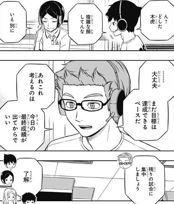木虎は、諏訪7番隊の連携のムダの無さを見て、複雑な表情を見せます。あれこれ考えるのは今日の最終スコアが出てからでいい、と古寺は言い、諏訪7番隊の作戦についてはこれ以上考えず残りの試合に集中することにします。