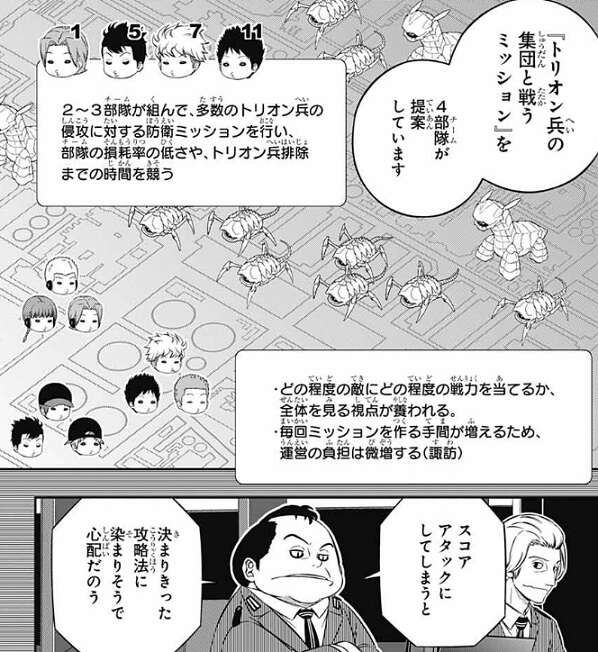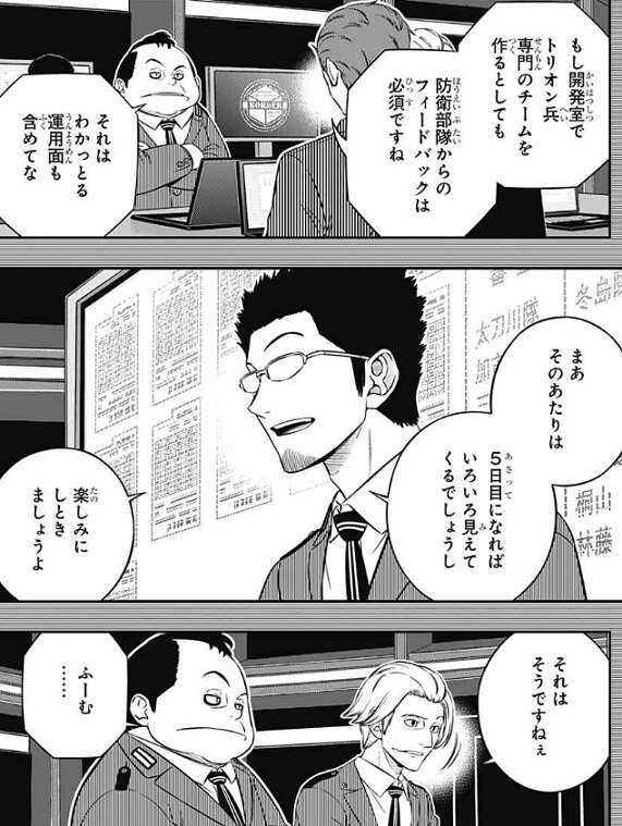 オペレーターが操作するのだと、処理能力でかなり差が出て来そうなことを武富は懸念します。しかし、トリオン兵はある程度勝手に戦ってくれるから、そこまで大変じゃないと言う意見が林藤から出ます。鬼怒田は、既に決まったことに文句は言いたくないが、トリオン兵を扱う部門と、トリガーを扱う正隊員は分けた方がいい、と意見を言います。トリオン兵に頼る戦い方を覚えてしまったら、B級中位以上と下位の差が開くことになる、と鬼怒田は懸念します。