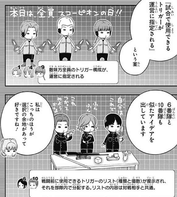 その次は3チームが提案している『試合で使用できるトリガーが運営に指定される』という案や、『戦闘前に使用できるトリガーのリスト(種類と個数)が提示され、それをチーム内で分配する、リストの内容は対戦相手と共通』という案です。同じようなアイデアですが、前者は普段使わないトリガーへの理解が深まるや、自分以外のポジションの強み・弱みが体感できるというのが提案理由で、後者は遠征先でのトラブル時に自前のトリガーが使えない状況でアドリブ力が鍛えられるが提案理由と、提案理由の内容が違います。他にも、『オリジナルの改造トリガー』を提案している王子や太一のアイデアもあります。