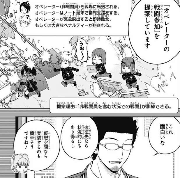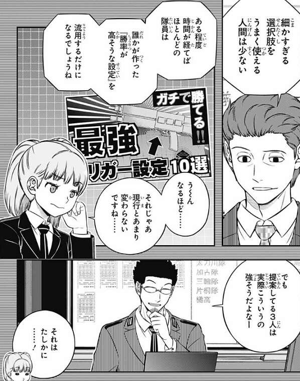 改造トリガーを作るのはエンジニアの手が足りなくなりそうですが、パラメータをいじれるシミュレーションツールを配れば、仮想フィールドだけでなら運用できそうで、蔵内がそのような案を出しています。しかし、鬼怒田は何か制限を付けないと、素人だと瞬間火力に全振りしたようなトリガーを作ってきそう、と意見を言います。他にも、ある程度時間が経てばほとんど隊員は、誰かが作った『勝率が高そうな設定』を流用するだけになりそう、といった懸念も出てきます。それだと現行とあまり変わらないので、意味がなくなってしまいそうです。