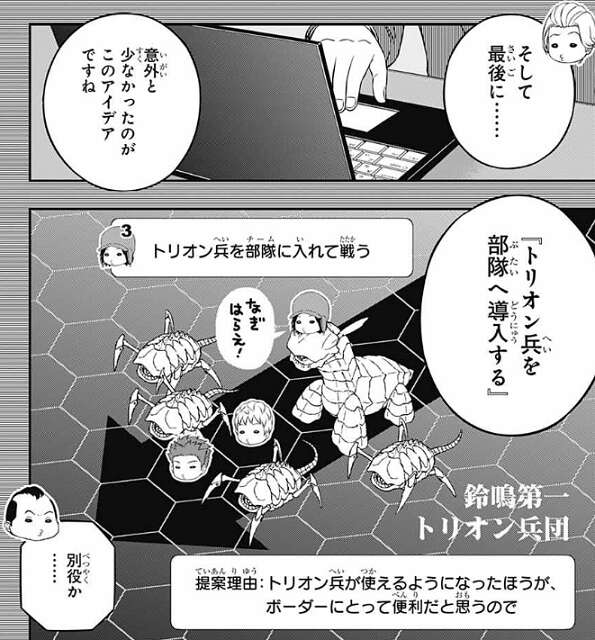 そして最後に、意外に少なかったのが『トリオン兵』を部隊へ導入する、といったアイデアで別役が提案しています。開発室からデータを回してもらえば、ランク戦での実装は可能みたいですが、武富は誰がトリオン兵を操作するのかを気にします。