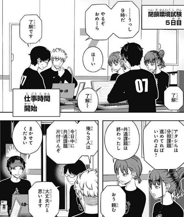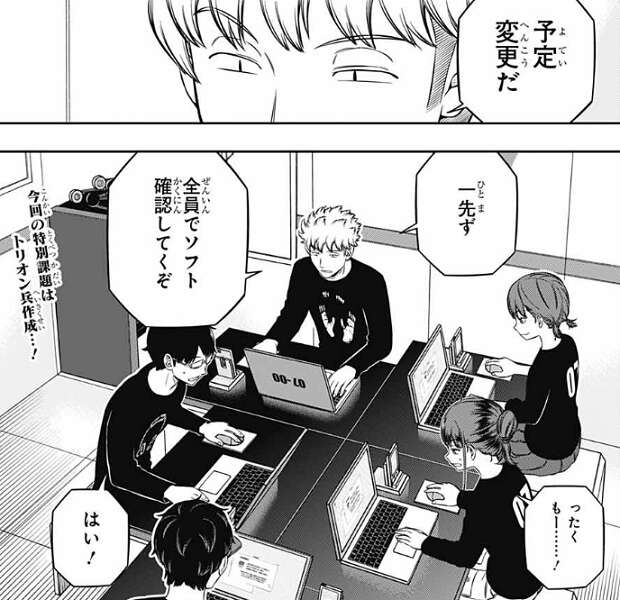そして、閉鎖環境試験 5日目から始まる特殊戦闘シミュの詳細が明らかになります。専用ソフトを使って、オリジナルのトリオン兵を各隊員1体以上作成し、特殊戦闘シミュで操作しなさい、というものでした。各隊員1体以上作成、という事は何体も作成しても問題ないように見えますが、その辺りは専用ソフトで多分制限が掛けられているのでしょう。他にも特別課題③で新しいアイデアがたくさん出ていたので、他のアイデアも採用されていてもおかしくありません。どんな特殊戦闘シミュになるのか、各チームはどう対応するのか、今後の展開も楽しみです。