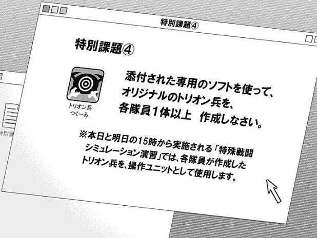 その内容は特別課題その④で、専用ソフト(トリオン兵つくーる)を使ってオリジナルのトリオン兵を、各隊員1体以上作成しなさい、というものでした。特殊戦闘シミュでこの作成したトリオン兵を操作ユニットとして使用する、とも書かれています。