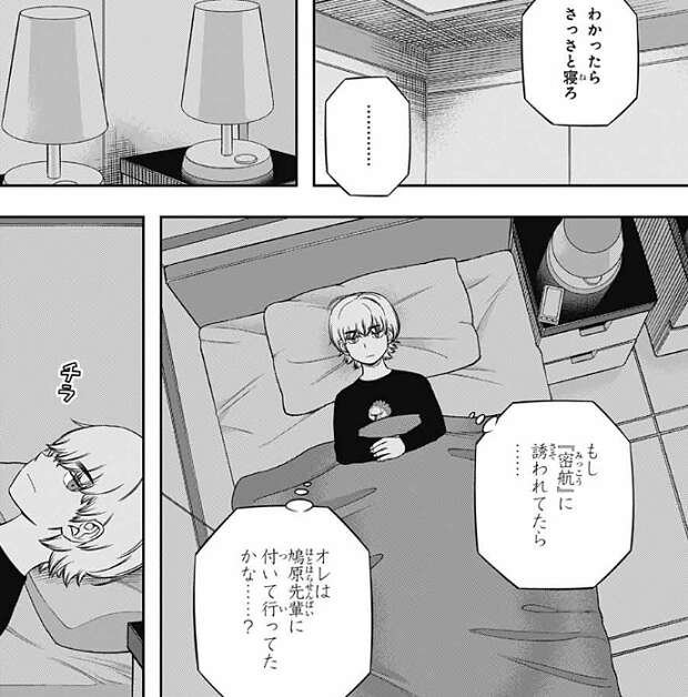 絵馬はこんな事まで言って二宮は大丈夫なのかと心配しますが、二宮は『隊長面接』で試験前に上層部の許可はもらっていたようです。二宮は絵馬が選抜試験に通ったら、もっと詳しい話をしてやる、と言い、さっさと寝ろと言います。消灯した部屋で絵馬は、もし「密航」に誘われていたら、自分は鳩原に付いて行ったかな……?と、自問自答します。