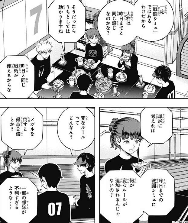 一方、諏訪7番隊では朝食を取りながら、今日から始まる特殊戦闘シミュがどんなものなのかを話していました。一応『戦闘シミュ』ではあるわけだから、大枠は昨日までと同じ感じでは?と、話してました。単純に考えれば昨日までの戦闘シミュに、何か変なルールが追加されるんじゃないの?と、香取は予想します。一昨日の特別課題にあった『ランク戦の新しいルールを考えてみよう』がそんな感じだった、と宇井が言い、諏訪はどんなルールを考えたのかという話になります。しかし、諏訪はあんまり覚えていないと言い、何を書いたかを誤魔化します。
