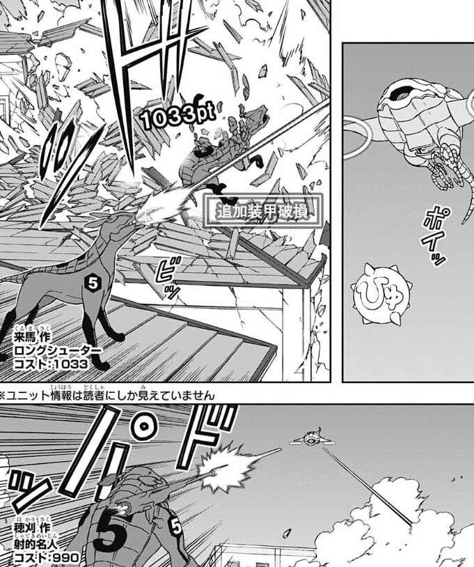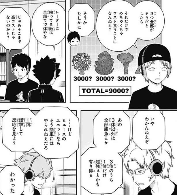 3体すべてが見た目通りヤバい強さなら、それだけでめちゃくちゃコストを食う事になりますが、レーダーに映っている敵は全部で12体だそうです。見た目からしてヤバそうなユニットのコストを仮に3,000とすると、3体の合計コストは9,000となります。第238話でチームコストが12,000と説明があったので、もしこの3体が本当に強いなら12体ものユニットを投入するのは難しい気がします。しかし若村は、3体以外は全部雑魚とか、3体のうち1体だけ超強ぇとかも有り得る、と言い、見た目のヤバそうなユニットを警戒します。そして、ヒュースのユニットならそう簡単にはやられないだろうと若村は予想し、1回爆撃するようにヒュースに指示します。ヒュースの爆撃機が動き出すと、二宮隊のユニットも動き出しますが、正面からなので若村隊のユニットは自動攻撃で迎え撃ちます。