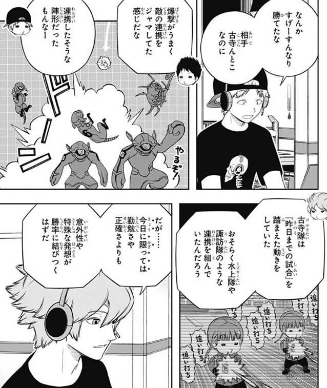 そこに草壁隊の宇野隼人が現れ、宇野は無言で喜多川にカロリーメイトのような物を与えます。それを食べた喜多川はすぐに復活、起き上がります。加古隊は宇野にお礼を言うと、宇野は無言で去っていきます。そして場面はモニタールームに移り、草壁隊の佐伯竜司がどっちのチームを見ればいいかで悩んでいます。嵐山は若村隊に注目、と言っていたようですが、米屋達は諏訪隊を見とけ、と言っていたようで、若村11番隊と諏訪7番隊のどっちを見るかで悩んでいます。すると、草壁隊の隊長・草壁早紀が佐伯に若村11番隊を見るように命令、草壁自身は諏訪7番隊を見るという事で佐伯の悩みは解決します。