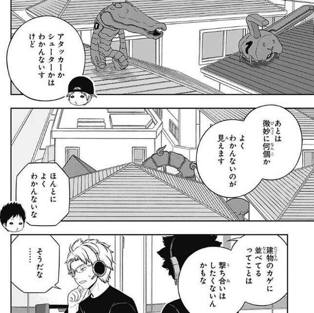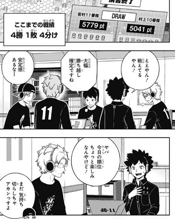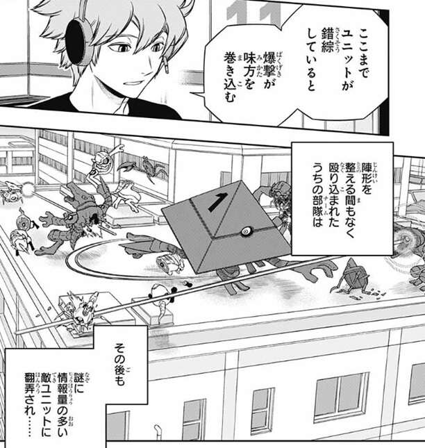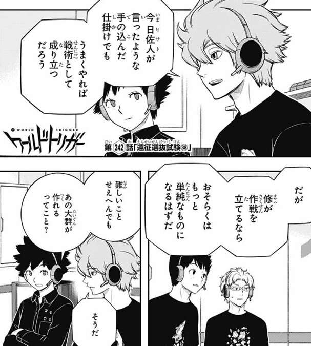 半崎は三雲がこの作戦をマジで考えてんの?とヒュースに聞き、ヒュースがこの推測が当たっていればの話だがなと答えると、これを初日に思いついて形にしてんのがすげえわ、と三雲に驚きます。そこが修の強みといえなくもない、とヒュースが答えると、B級2位は伊達じゃないってことだな……、と笹森も三雲の発想力に驚きます。