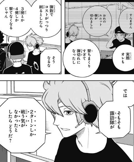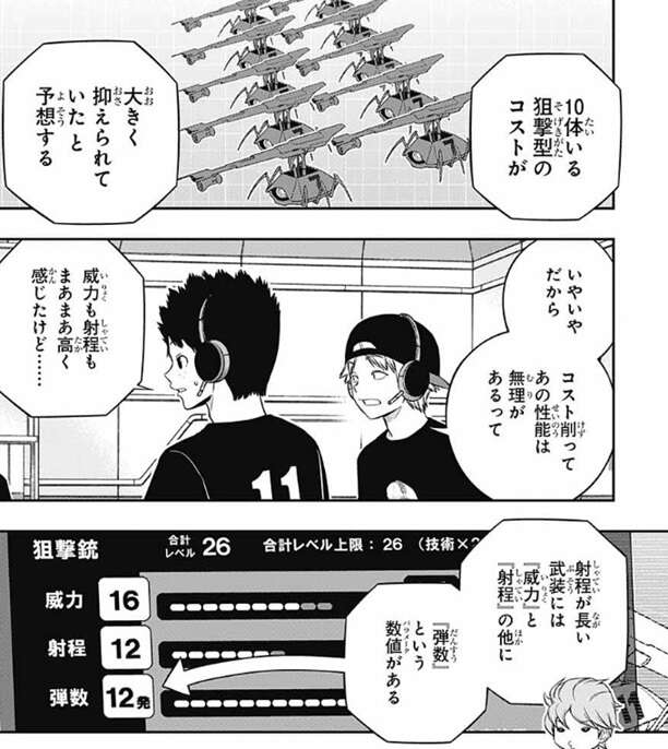 ヒュースの考えは細井と同じく、10体いた狙撃型のコストが大きく抑えられていたと予想します。しかし、半崎と笹森はコストを削ってあの性能は無理がある、諏訪隊の狙撃型は威力も射程もまあまあ高かった、と反論します。するとヒュースは、射程が長い武器には『弾数』のパラメータがあると指摘します。