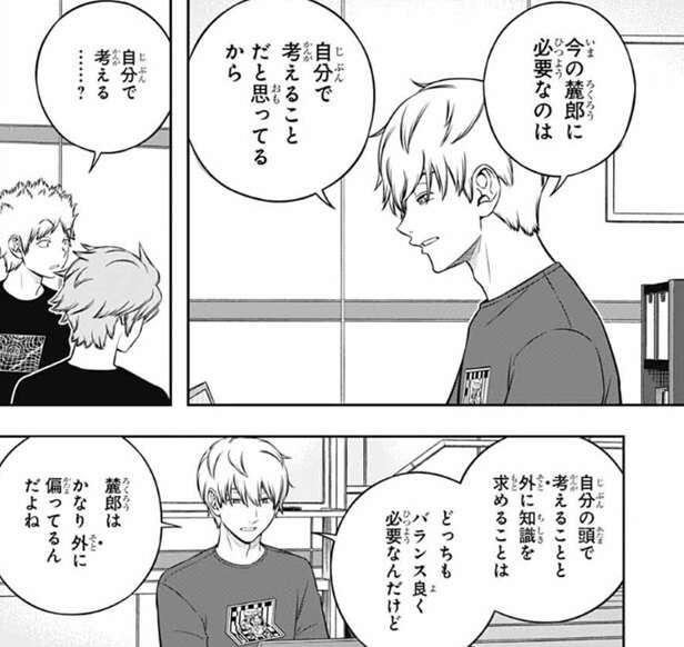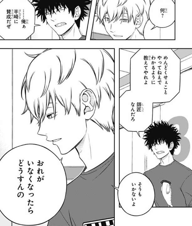 犬飼の考えを聞き半崎は、いやいや遠回し過ぎるでしょ、ふつうに「自分で考えろ」って言えばいいじゃないすか、と言いますが、それが難しいと犬飼は答えます。若村は「自分で考えろ」と言われても、犬飼が設定したこの問いの『正解』は何だろう?って考えちゃう性格なんだよ、と犬飼は言うと半崎は納得し、ヒュースも、そこまでの考えがあるなら、オレが麓郎にあれこれ言うのは控えたほうがよさそうだな、と言います。