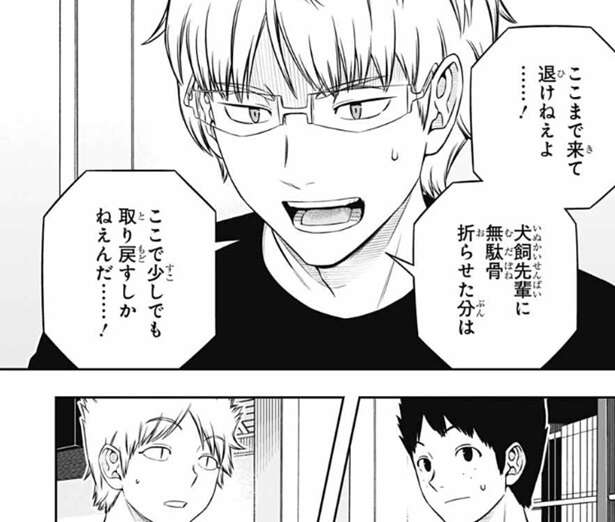 先ほどまでの通信デバイスでの会話を聞いていた影浦は、半崎のふつうに「自分で考えろ」って言えばいいと言う考えに賛成し、師匠なんだから面倒なことやっていないでわかるように教えてやれよと犬飼に言いますが、おれがいなくなったらどうすんの、と犬飼は答えます。