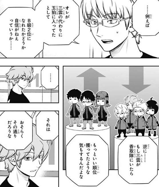 トリガーを使った戦闘で一番大きな要素はトリオン量の大小で、一方でさっき若村が言ったのはチーム成績の優劣の話だ、と言い、単純にチームとして玉狛第2の方が香取隊より上だったと言う結論では不満なのか、とヒュースは聞きますが、若村は、三雲の代わりに玉狛第2に入ってもB級2位になれたか自信がない、と言います。さらに、もし三雲が香取隊にいたらもっといい順位を獲っていた気もする、と若村が言うと、ヒュースは、おそらくその通りだろうな、と言います。半崎と笹森はヒュースと若村の会話を間近で聞いていますが、ヒュースが言いにくい事をずばりと言うので傍でひやひやしています。