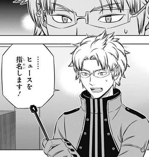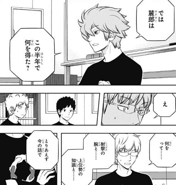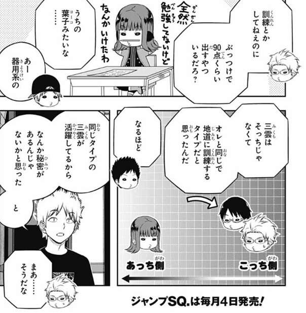 もう一度ヒュースに言い直し、三雲には才能がなくて環境が優れてるわけでもない、それでも三雲はランク戦でデビューしてすぐB級2位獲った事、三雲より1年半以上長くB級ランク戦をやっているのにあっさり抜かれた自分と何が違うか?を若村は気にしていると質問すると、ヒュースはそういう話か、と納得します。そしてヒュースは、さっき言った『個人の才能』の話をするなら、三雲より若村の方が間違いなく上だろう、と言います。