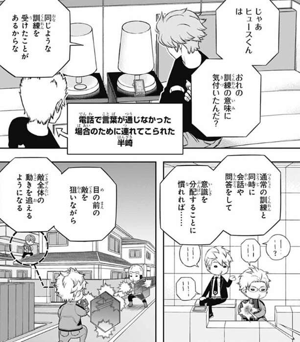 しかし、これを説明するのは気が進まない、とヒュースは言い、理由は三つあると言います。一つ目は、若村と三雲の違いを説明してもおそらく若村に得るものはない、とヒュースは説明します。二つ目は、若村が精神的なダメージを負って、選抜試験に影響が出る惧れがある、とヒュースは説明します。この説明を聞き、どんだけキツいこと言う気だよ、と半崎は心の中であきれます。