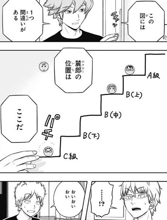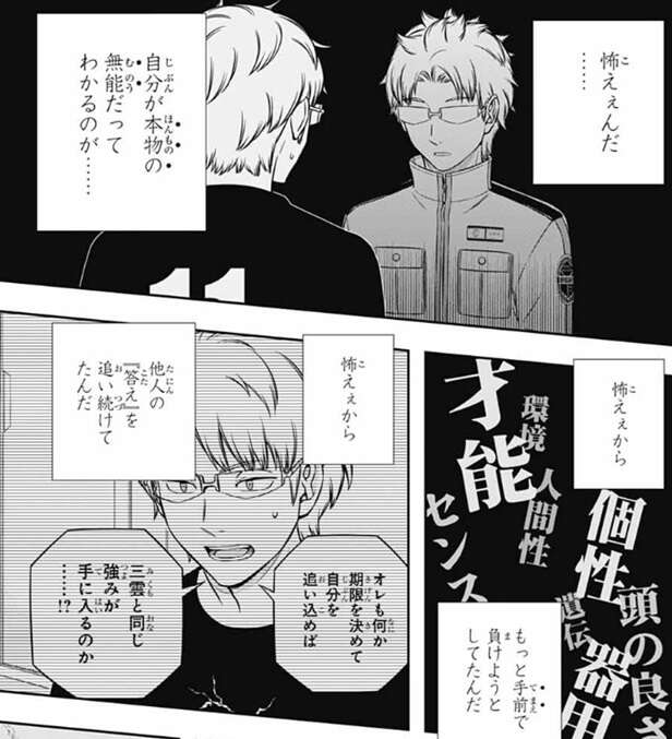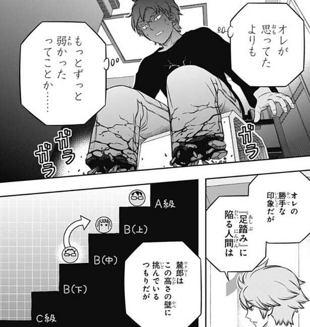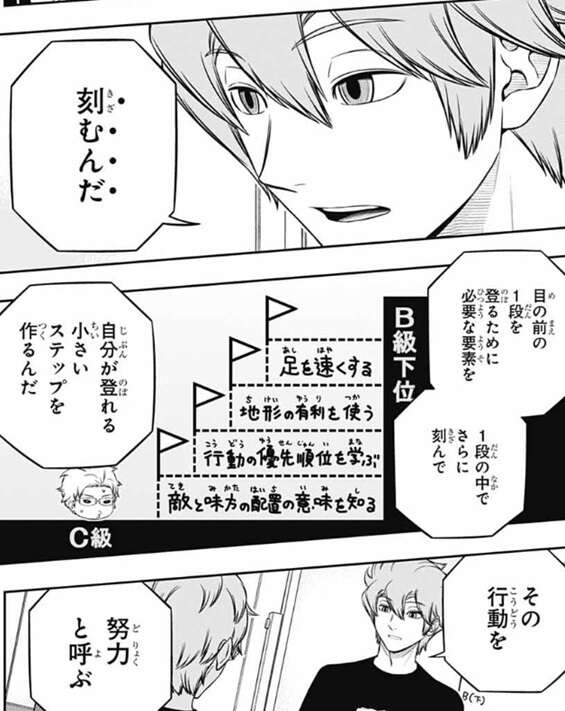 しかし、完全に自信を失くしてしまった若村は、一から出直したとしても万が一それで一番下の段さえ登れなかったら、そもそも最初から1段上る力すら無かったとしたらどうすりゃいいんだ……!?と、若村は弱音を吐きます。するとヒュースは刻むように若村にアドバイスします。目の前の1段を登るために必要な要素を1段の中でさらに刻んで、自分が登れる小さいステップを作るようにヒュースは言い、その行動を努力と呼ぶ、と若村に言います。