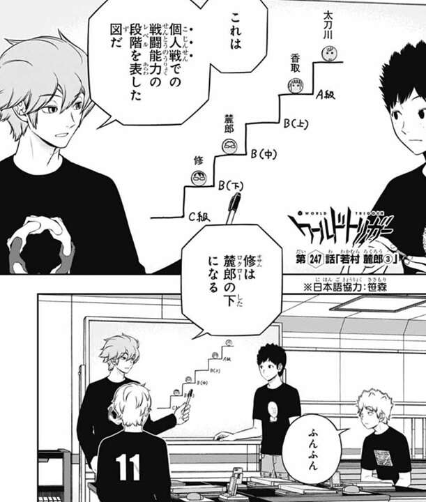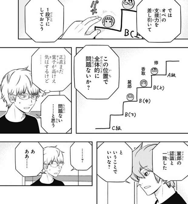 今度はチーム戦での能力の順に変えると、一番上が三雲、香取で、若村はB級中位の位置になります。ここで若村の意見で、香取は三雲より一段下に落とします。香取はオペレーターの染井華の指示でピンチを凌ぐ場合も結構あるので、一段下に落としB級上位の位置となります。