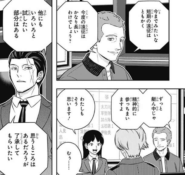 桐山も、今までみたいな短期の遠征ではなく今度の遠征はかなり長いので、ずっと艇の中では精神的に参ってしまうと沢村の意見を支持します。最終的に色々試したい部分もあり、思う所もあるだろうが了承してもらいたい、と城戸から言われると、根付もこの追加ルールを受け入れます。最後の『特別課題』に関して今日は予定通り実施する確認をしたところで、6試合目の結果が出ます。諏訪隊は6試合目まで終わって、3勝1敗1分けと高い勝率で折り返しとなっていました。