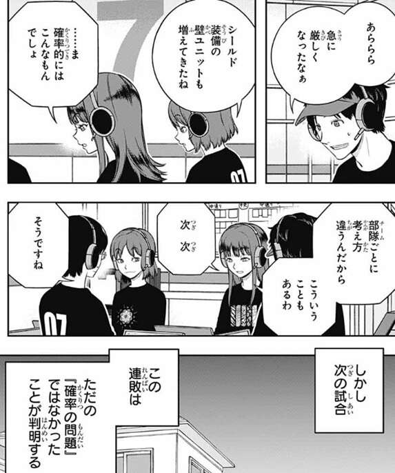 三雲の予想通り壁ユニットを用意しているチームが多く、『急所攻撃』もちゃんと刺さっているようで、三雲の省エネ作戦がちゃんとハマっています。しかし、後半戦になると諏訪隊は三連敗を喫します。
