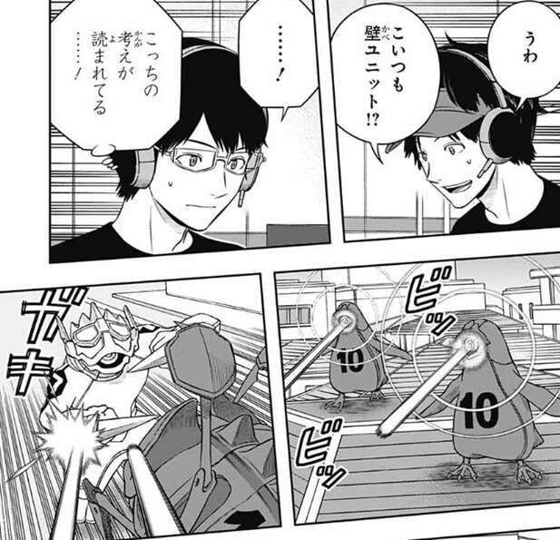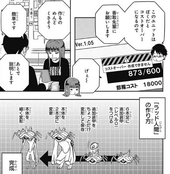 三雲はどのチームもある程度狙撃や射撃の対策をしてくると予想し、その場合諏訪隊が困るのが防御に特化したユニットを盾にされて、狙撃を正面から受けられる事だと説明します。その場合、切り詰めた弾数を固い相手に吸われて、狙撃ユニットは弾が足らなくなり狙撃ユニットが何も出来なくなる、と香取が三雲の考えを代弁します。ここで三雲は固い相手用に考えたユニットを見せますが、見た目はかなりキモいユニットです。三雲は対壁役専門のユニットだと説明し、見た目がキモいのは壁役をこっちに向けてくれた方が助かるから、見た目で警戒してもらおうとこんな外見にした、意図を説明します。ちょうど、特殊戦闘シミュ1日目に歌川1番隊や二宮隊8番隊がやった感じだね、と宇井が言います。