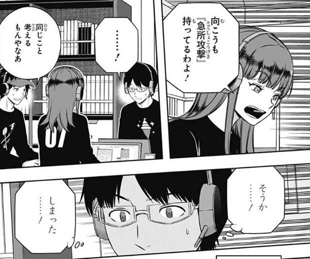 村上隊と先に当たったチームが、『急所攻撃』対策でシールドを使うようになったからうちが勝てなくなった、と香取は試合順の問題だと言い、順番はどうしようもない、それも含めての運ゲーだと言います。しかし三雲は、『急所攻撃』は知ってさえいれば対策が簡単な作戦、というところが問題だと言います。ネタが被ることを見越して、もっと対策しにくい戦術を選ぶべきだった……、と三雲は凹みますが、まだ1試合残っているので凹むのは終わってからでいい、と諏訪は言います。