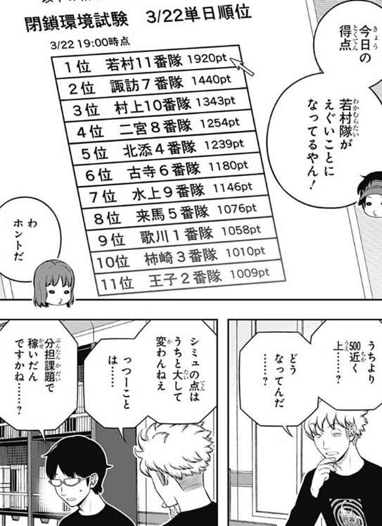 一方、若村隊は3/22単日でエグイ得点を取っていますが、これは第248話でやっていたヒュースがトリオン工学系の分担課題を答え、細井のパソコンで回答を入力していく作戦がハマってここまでの得点を取ったのだと思います。