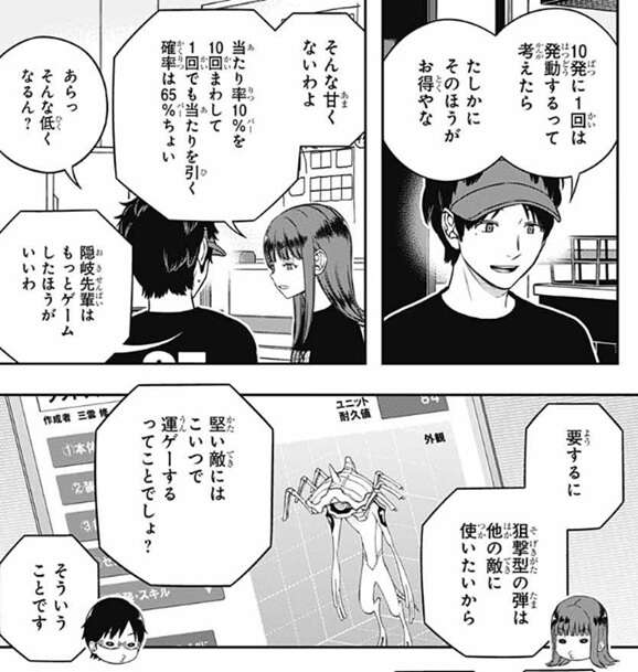 10回に1回は発動するって考えたらそっちの方がお得、と隠岐は言いますが、当たり率10%を10回まわして1回でも当たりを引く確率は65%ちょい、と香取は言い、そんなに甘くないと隠岐に言うと、隠岐先輩はもっとゲームをした方がいいと忠告します。要するに狙撃型の弾は他に使いたいから、固い敵にはこいつで運ゲーするってことでしょ?と香取が言い、防御が不安だから諏訪のユニットを防御寄りに調整して新ユニットを守ってもらう感じで…、と三雲が補足すると、諏訪は三雲の省エネ作戦をシンプルでいいと支持します。