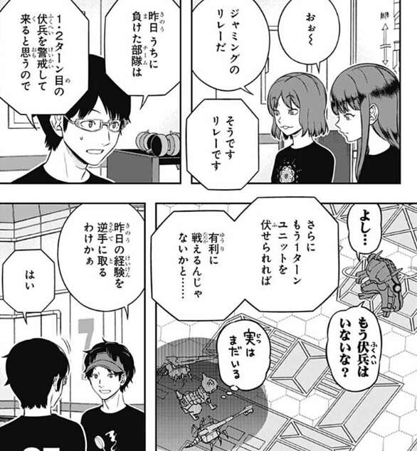 さらに三雲はジャミングの小ネタも用意していました。ジャミングは最大までポイントを振っても効果が2ターン分しか続きませんが、1・2ターン目をジャミングするユニットと、2・3ターン目をジャミングするユニットがいれば切れ目なくジャミングが続けられるので、ジャミングのリレーを行おうという作戦です。昨日諏訪隊に負けたチームは、1・2ターン目の伏兵に警戒すると三雲は予想しますが、さらにもう1ターンユニットを伏せれば有利に戦えると三雲は考え、昨日の経験を逆手に取るこの作戦を考えたそうです。三雲の省エネ作戦を聞き、諏訪はこれだけネタがあれば十分と判断、特殊戦闘シミュ2日目は肩の力抜いてサクッとやんぞ、と全員に指示を出します。