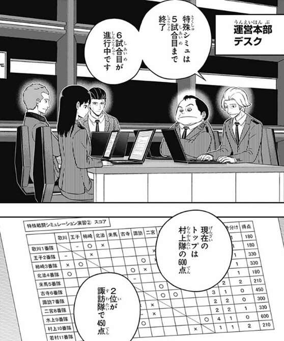 そこから2時間と少し後、6試合目が進行中の状況で運営本部デスクでは上層部がこれまでの結果を確認していました。現在のトップは村上10番隊、2位が諏訪隊で、それを追って柿崎3番隊、北添4番隊、水上10番隊という成績になっていました。村上隊は第243話で言っていた『4日目』のつもりで先回りして対策をする作戦が当たっているようで、鬼怒田が村上隊の強さは目を引くと言っています。