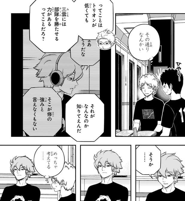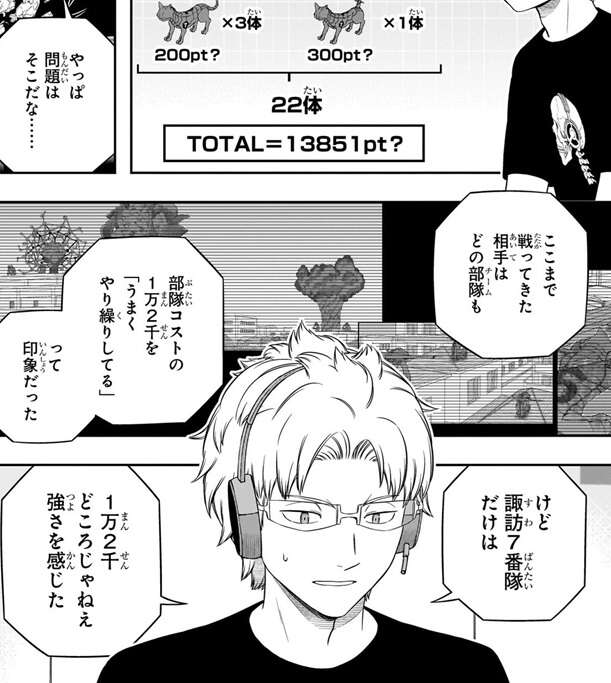 ヒュースは「修が諏訪隊の作戦を立てた」という前提なら、ある程度の推測は可能と言い、諏訪隊の強さの秘密を推測します。それは、諏訪隊の『性能負けしない22体の大群』は、攻撃を2ターンのみに限定することで成立していた、という推測で、諏訪隊の10体いる狙撃型の弾は2ターン分のみにコストを抑えていて、それによって全体のコストを抑えていたというのがヒュースの考えでした。若村隊のメンバーはヒュースの推測を聞いて、三雲が特殊シミュ1日目でアイデアを形にした事に感心します。