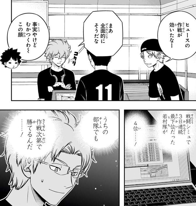 28巻では、特殊シミュが始まり若村隊はヒュースの飛行型トリオン兵を攻撃に使う作戦を採用します。この作戦が当たり、今まで戦闘シミュでは最下位続きだった若村隊ですが、最下位を脱出し特殊シミュ1日目の順位は一気に4位まで浮上します。さらにヒュースと細井にトリオン工学系の分担課題を担当してもらう事で、総合順位も最下位から脱出する希望があると若村は考えます。